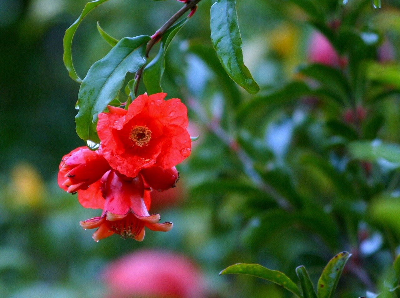 석류꽃은 일반적으로 5~7월 사이에 피시 시작합니다. 석류꽃은 빨간색이나 주홍색이 섞인 화려한 꽃으로 가을까지 피어납니다. 꽃은 자루 끝에 하나씩 피거나 작게 무리를 지어 피어나서 수분(受粉)을 통해 열매로 발전하기 시작합니다. 석류꽃의 화려함은 곤충들을 끌어들이기에 충분한데, 꽃의 수분(受粉)은 이렇게 모여든 곤충을 매개체로 이루어집니다.